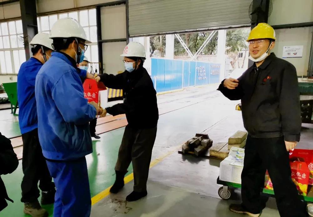 2月15日,受公司領(lǐng)導(dǎo)班子委托,當天值班領(lǐng)導(dǎo)總會計師、董事會秘書楊繼冬,總經(jīng)理助理、物資采購部部長李蓬川來到下料生產(chǎn)現(xiàn)場,對春節(jié)假期期間主動加班職工進行慰問,感謝他們?yōu)楸S脩艏毙璧膿敽托燎诟冻觥?
