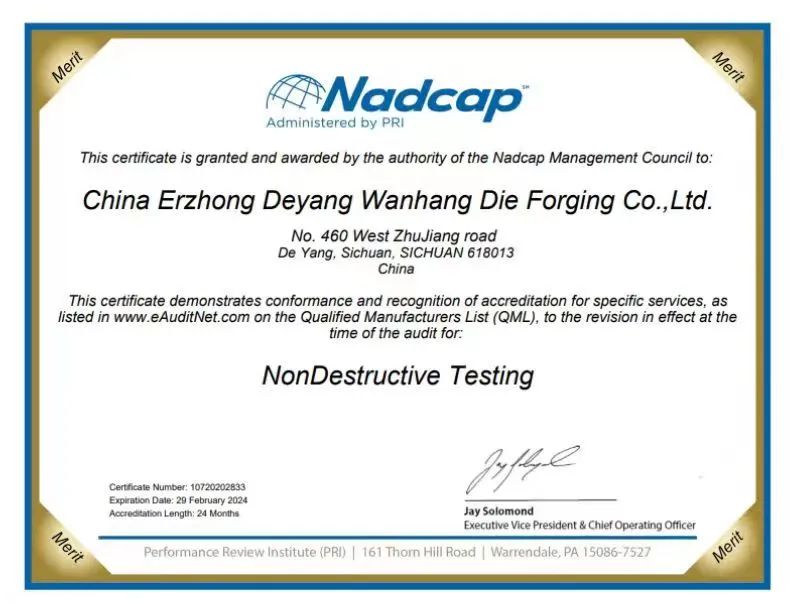 萬航模鍛再次獲得NDT Nadcap金牌證書