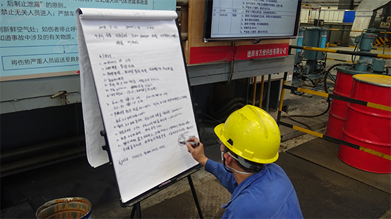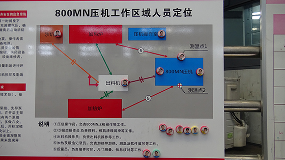 萬航公司模鍛廠800MN生產(chǎn)班組在該13件產(chǎn)品的制造過程中,以《鍛造工藝卡》為操作綱領(lǐng),嚴(yán)格貫徹落實(shí)各項(xiàng)工藝要求。在鍛造前,班組成員對制造過程進(jìn)行了全面梳理,分解落實(shí)了各工序的操作要求,并對人員工作區(qū)域進(jìn)行了定位。制造過程中,班組各工序人員嚴(yán)格按照分工職責(zé)在定位區(qū)域內(nèi)按生產(chǎn)前議定的操作要領(lǐng)規(guī)范操作,整個(gè)鍛造過程有條不紊、井然有序,且每一件產(chǎn)品的生產(chǎn)過程均保持一致。