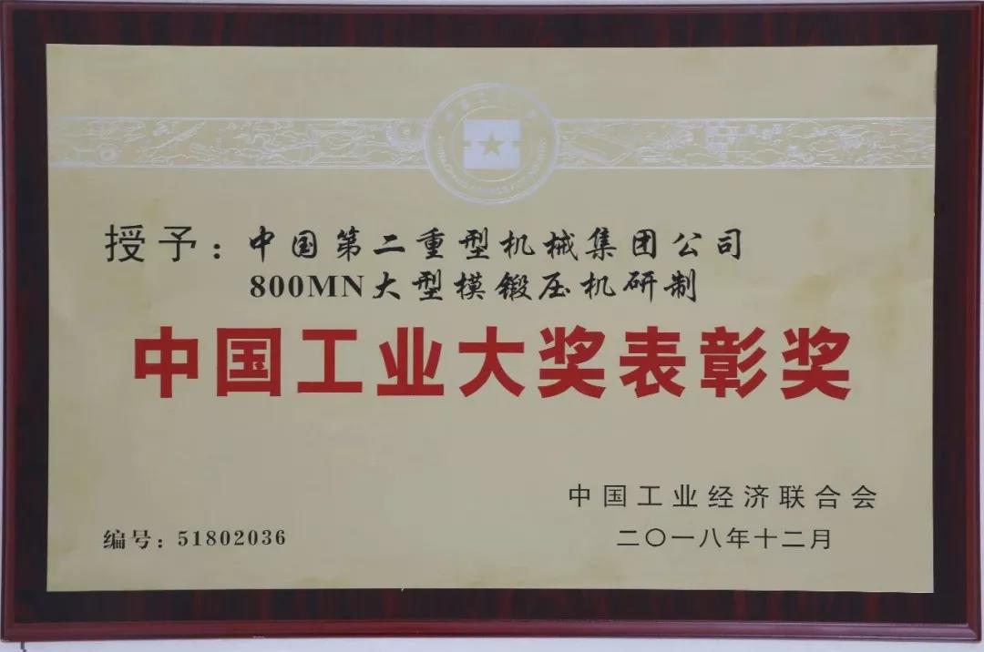 中國第二重型機(jī)械集團(tuán)有限公司(以下簡稱“中國二重”)的800MN大型模鍛壓機(jī)(8萬噸模鍛壓力機(jī))研制項(xiàng)目獲得“中國工業(yè)大獎表彰獎”。