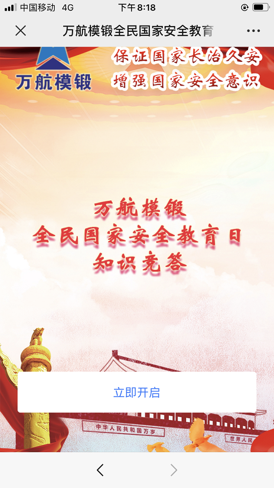 4月15日是第5個(gè)全民國(guó)家安全教育日。萬(wàn)航模鍛以“堅(jiān)持總體國(guó)家安全觀,統(tǒng)籌傳統(tǒng)安全和非傳統(tǒng)安全,為決勝全面建成小康社會(huì)提供堅(jiān)強(qiáng)保障”為主題,開展了內(nèi)涵豐富、形式多樣的國(guó)家安全宣傳教育活動(dòng)。